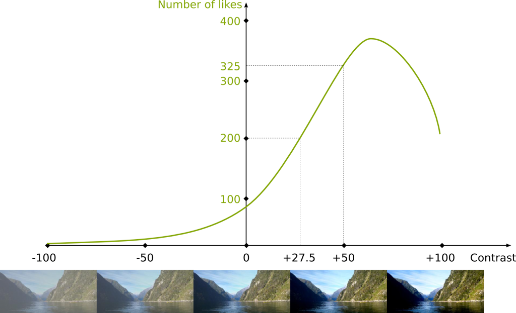 Obviously, it’s far from reality… But it’s the assumption we’re going to work with. In this figure you can see that any contrast value is mapped with a number of likes. For instance, if the contrast value is 50, then the number of likes is 325. Meanwhile, if the contrast is 27.5, then the number of likes is 200.